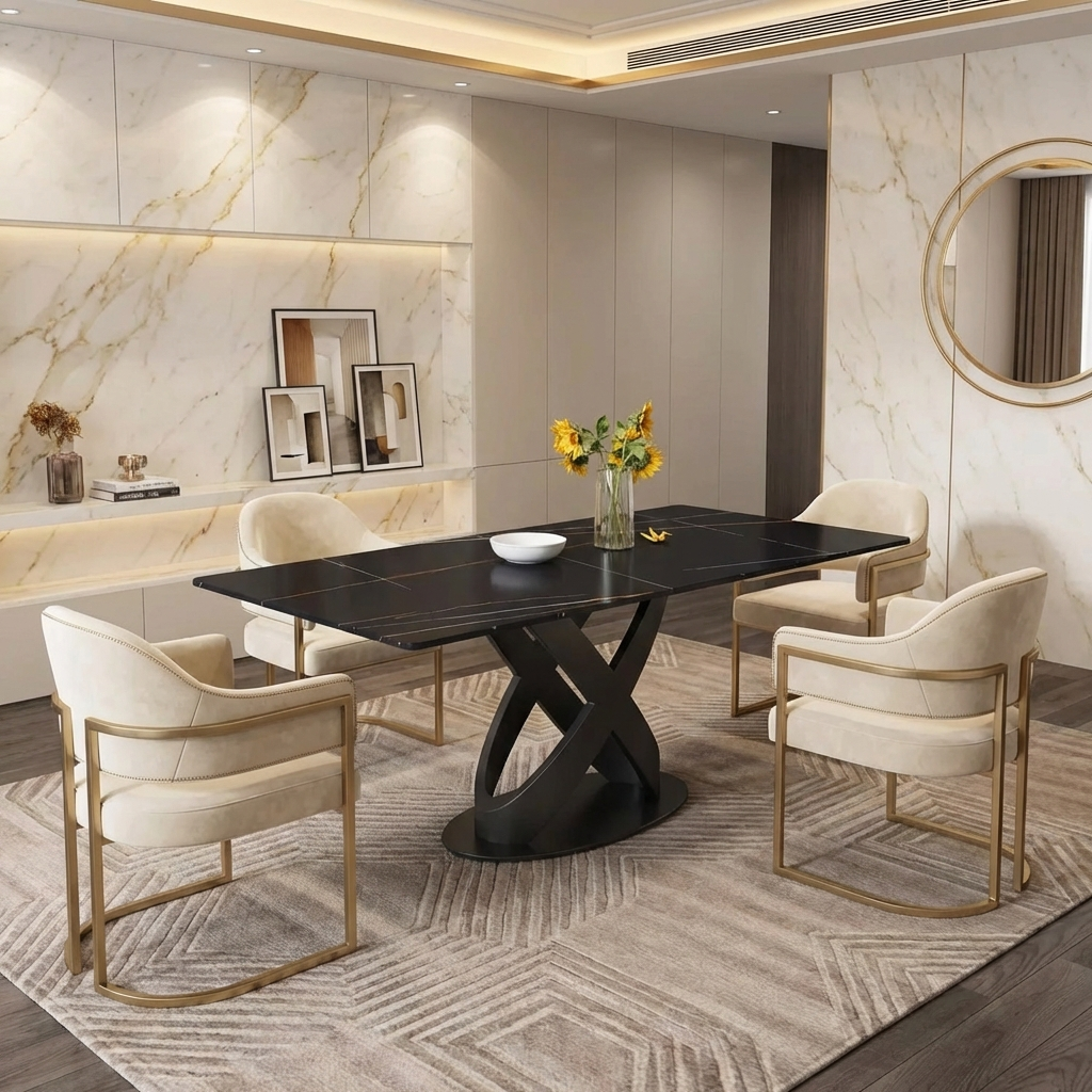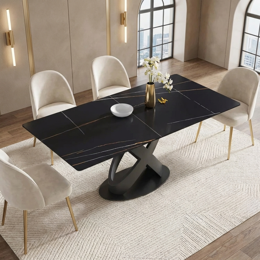 Calvara Atlas Elegant Dining Tables | 70" Rectangular Black with Velvet Black Base for 6