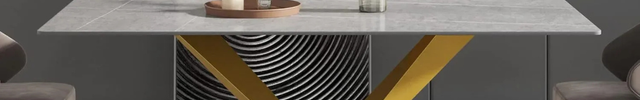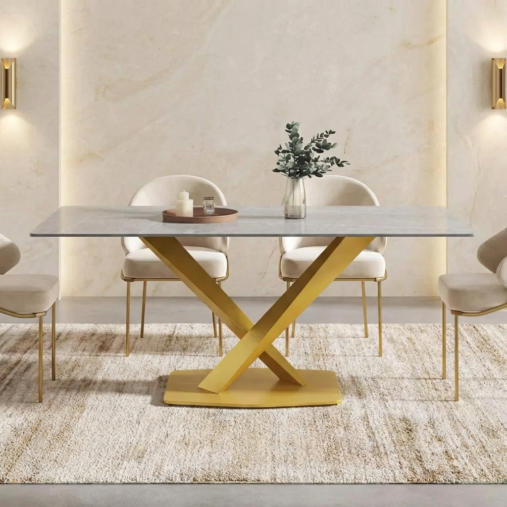 Marbela Elegant Dining Tables | 70" Rectangular Gray with Classic Gold Base for 6