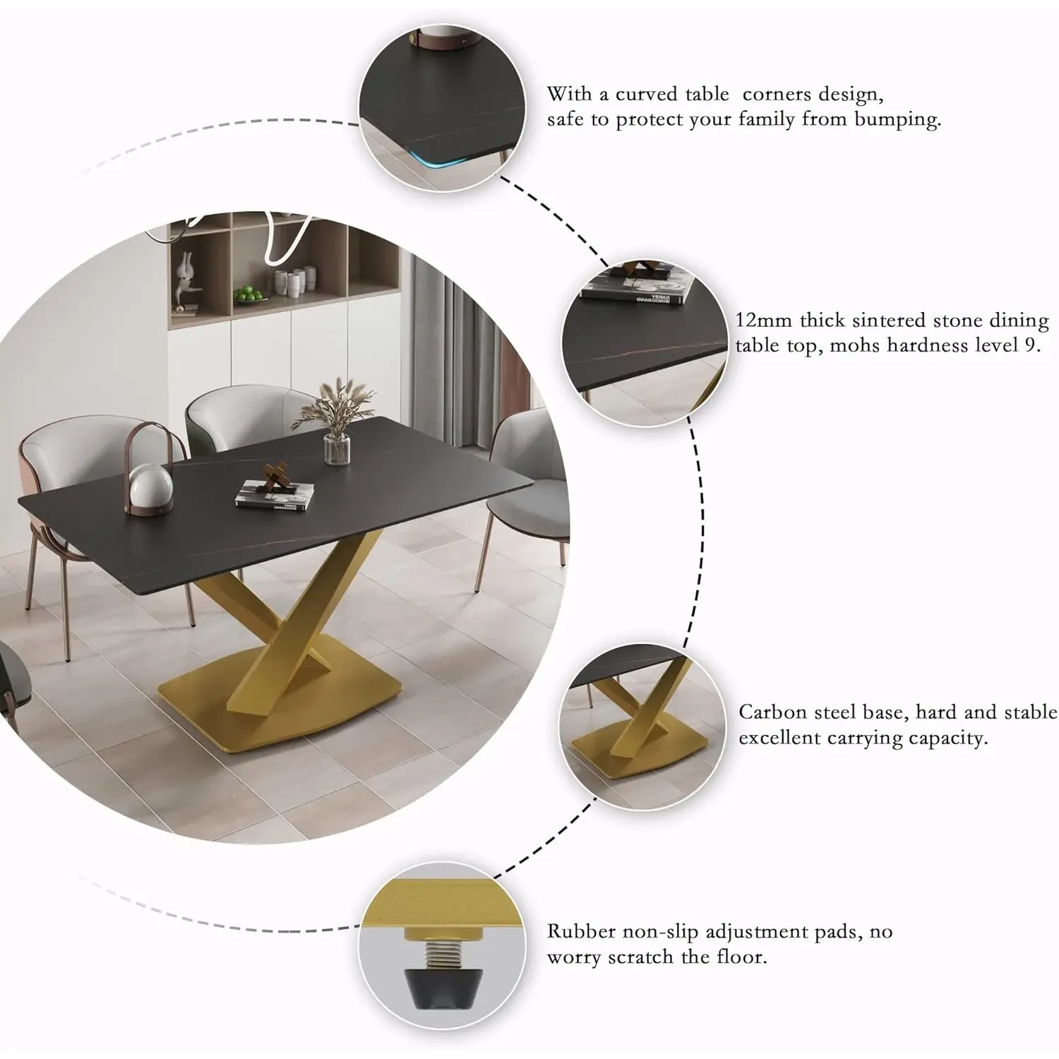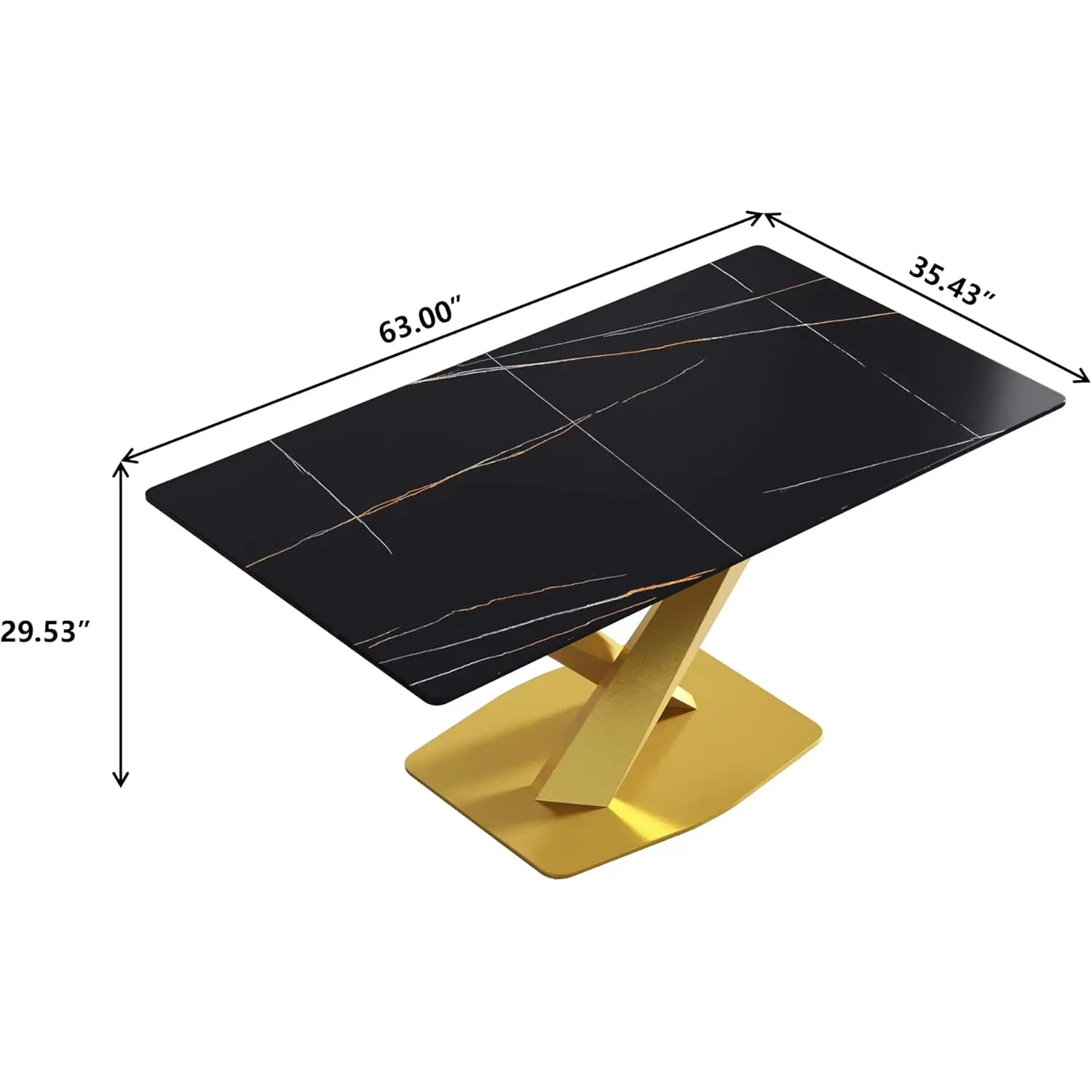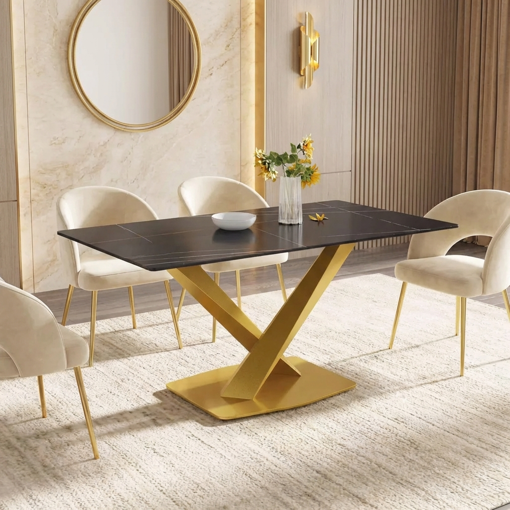 Marbela Dining Table | 63" Rectangular Black Dining Table | Gold Metal Base – Elegant & Timeless Look