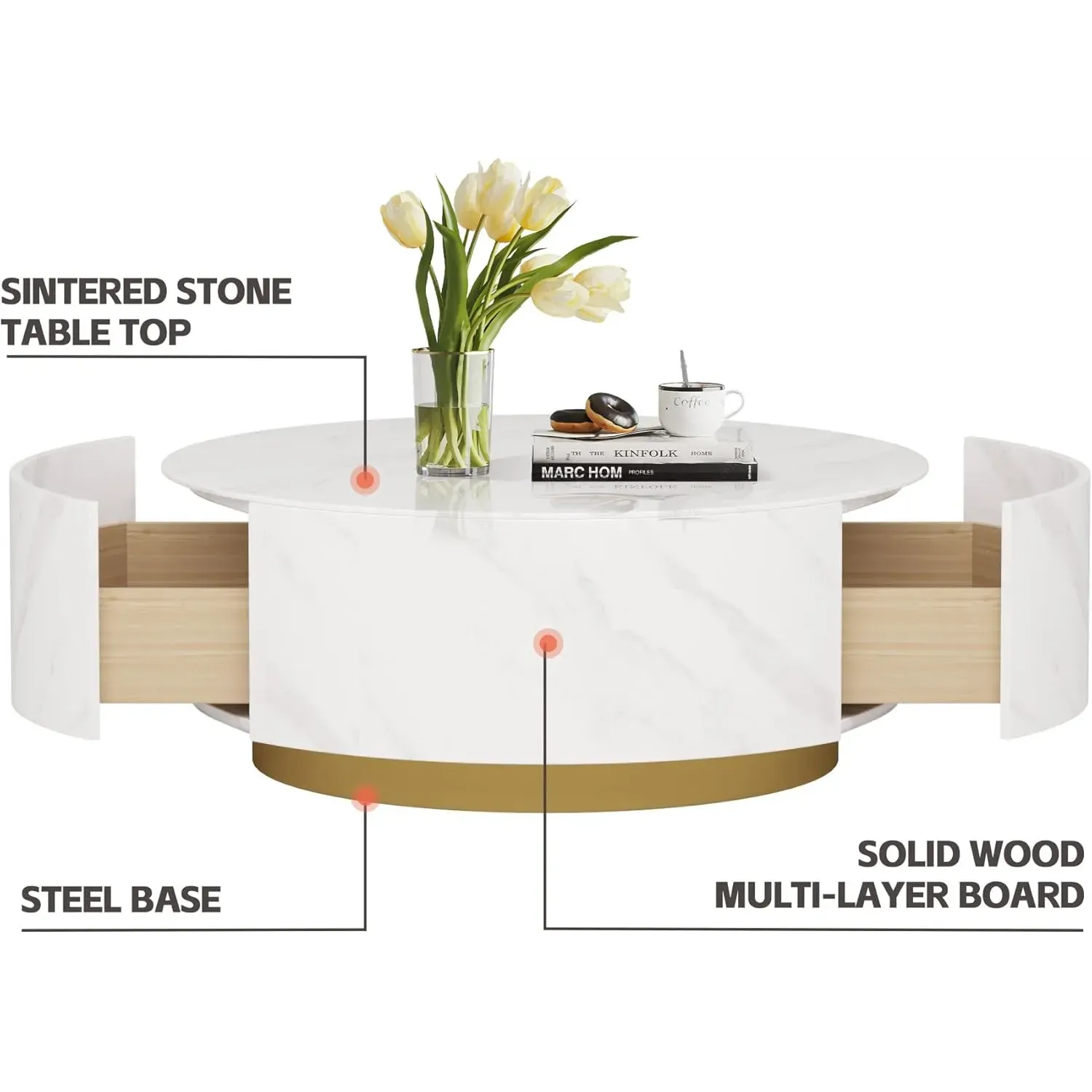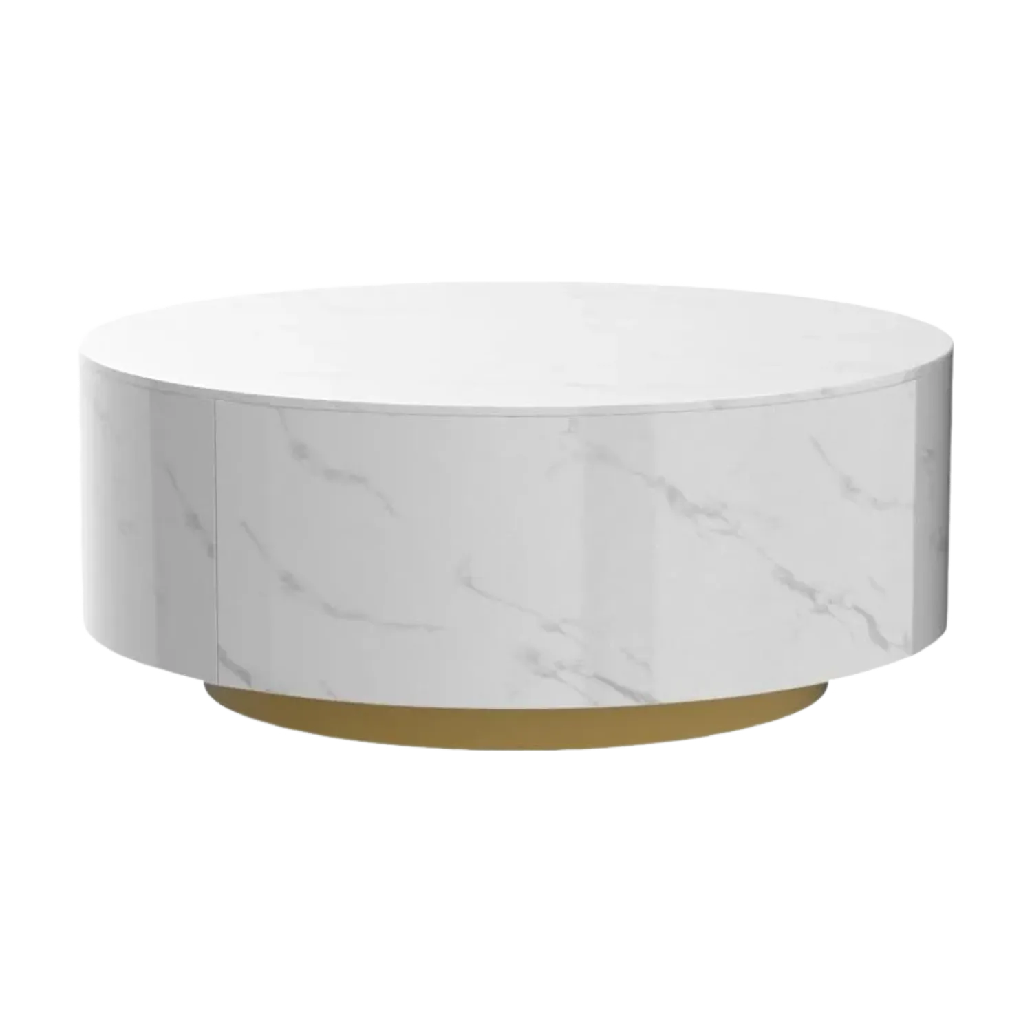 Solenza Zaya 33" Round White Marble Coffee Table | Gold Base & Storage